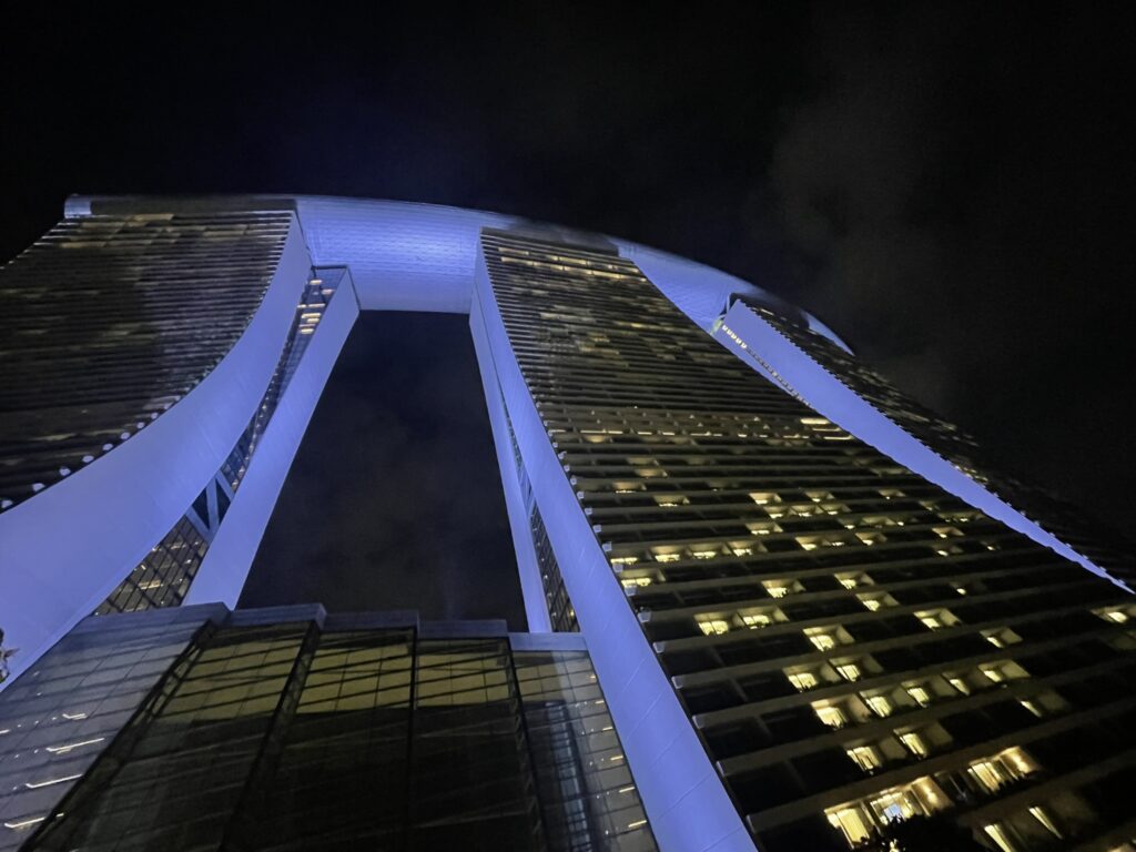 Najpoznatiji od njih, “Marina Bej”, zapravo je hotel u čije tri gigantske izvijene putanje ka nebu nema mesta ni u januaru 2027, a noćenje stoji 800-1000 dolara, kažu Buking i Gugl. Na njegovom vrhu polegla je struktura poput aviona koji je sleteo, sa sve skupim restoranima, onim bazenima sa ivicama-liticama i ostalim mestima za uživanje u nekakvom luksuzu i hvaljenju istim.